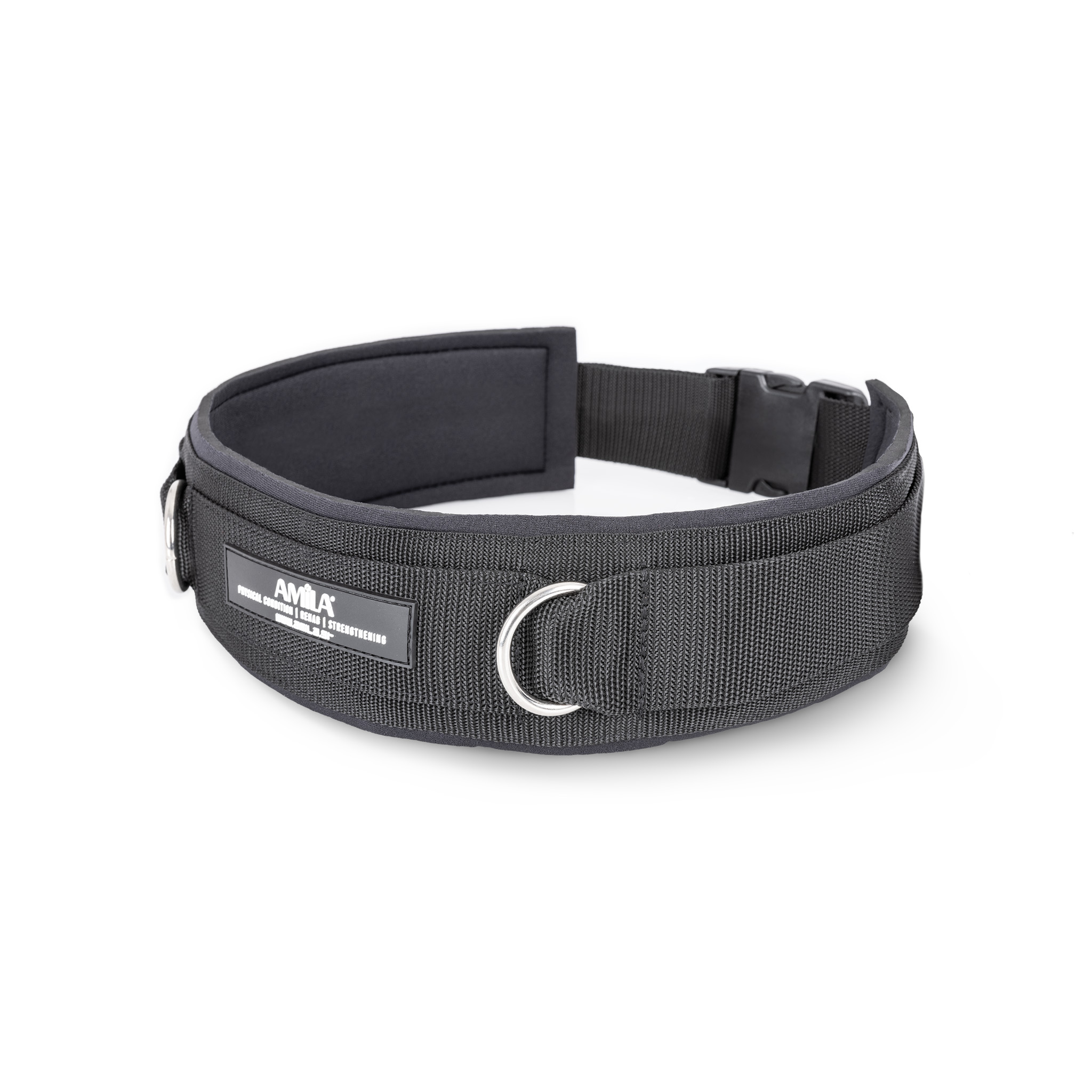 Η Premium ζώνη μέσης από την AMILA® είναι κατασκευασμένη από Nylon υψηλής αντοχής ύψους 5 εκατοστών. Επάνω στην ζώνη είναι ραμμένος έξτρα ιμάντας ύψους 8 εκατοστών που φιλοξενεί ένα μαξιλάρι ύψους 7 εκατοστών για να είστε πιο άνετα. Συμπεριλαμβάνει 2 ασημένια ατσάλινο δαχτυλίδι τύπου D ring 6 χιλιοστών τα οποία απέχουν 20 εκατοστά μεταξύ τους.