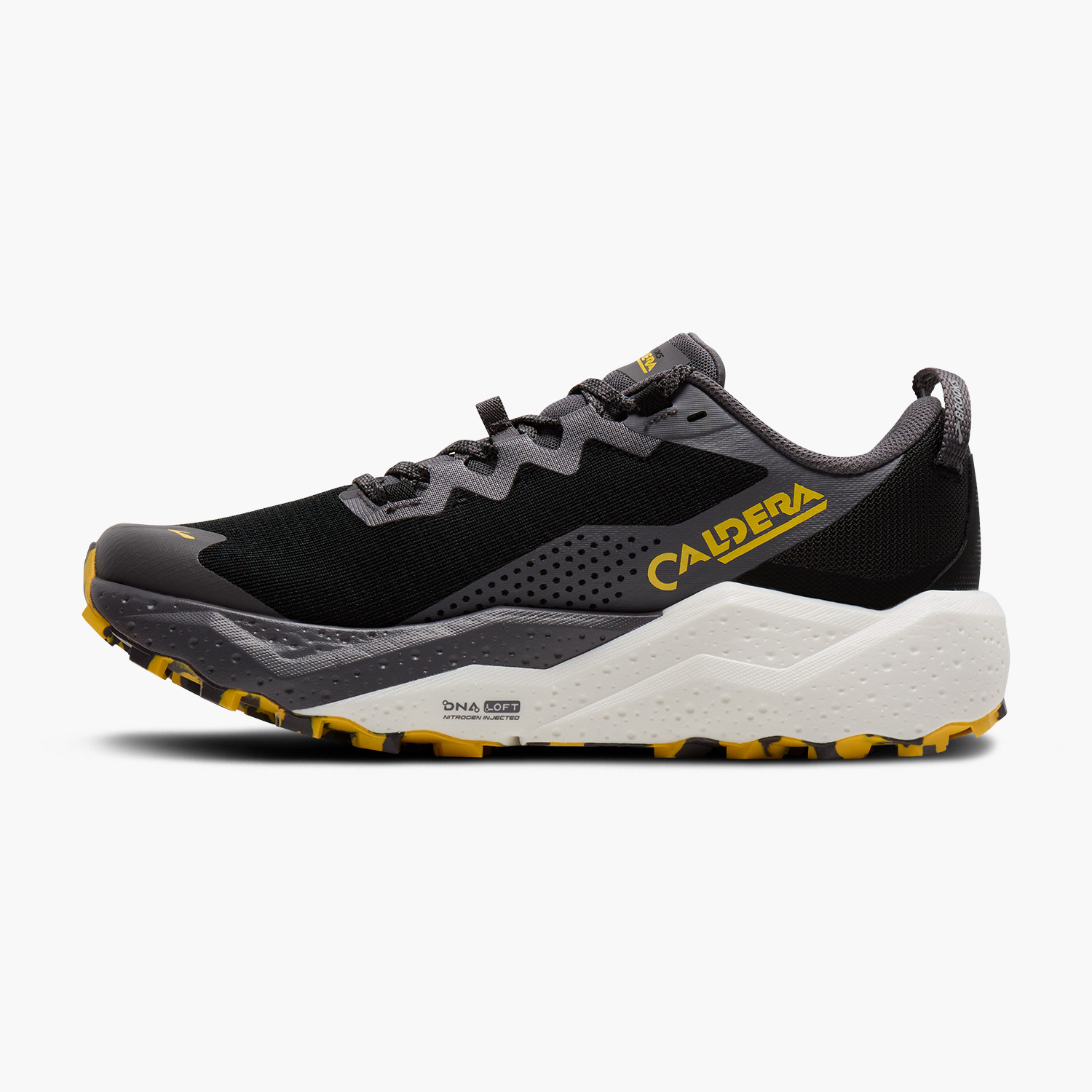 Η μεσαία σόλα του Brooks Caldera 8 trail running χρησιμοποιεί DNA LOFT v3 με έγχυση αζώτου. Ο αφρός προσφέρει βαθιά απορρόφηση κραδασμών, μειώνει την καταπόνηση σε γόνατα και ισχία και διατηρεί ελαστική επιστροφή ενέργειας σε πολύωρη προσπάθεια.